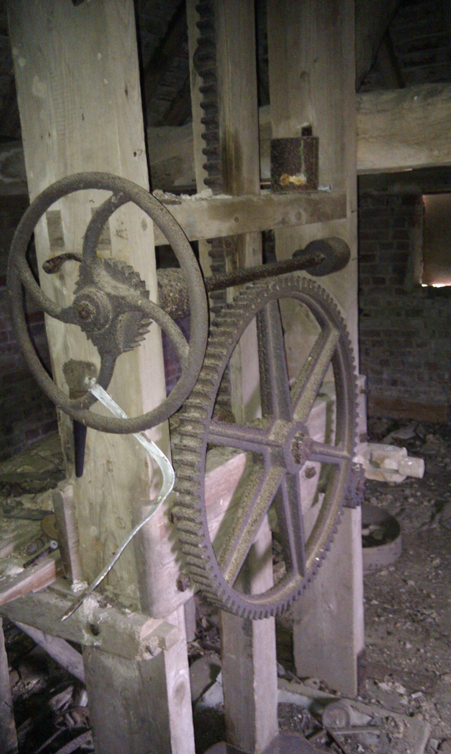 I assume that one would have turned the hand-wheel; a ratchet can be seen immediately behind it which would have stopped it being forced backwards. And I assume that the large cog drove the rack and pinion mechanism that can also be seen, which would turn the circular force into downwards force to act on the board which would have done the pressing. But then the force from the handwheel would have needed to go through a right-angle to drive the large cog, and I can’t see anything which would do this. Possibly missing. It would be nice one day to get all this working again. At the moment it is rusty and immobile.