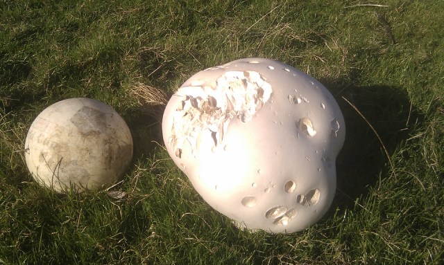 The puffballs are back.  Calvatia gigantea.  They always appear in the small field between the house and the front pond.